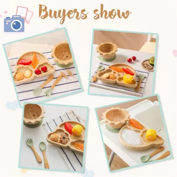 4-Piece Bamboo Wood Children’s Sun Bowl Set - Rainbow Clouds Design