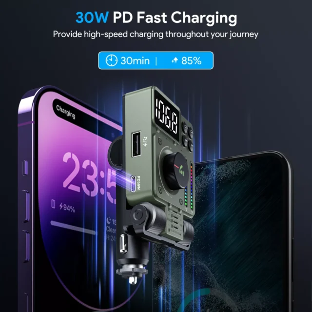 This FM transmitter stands out with its ability to combine advanced audio technology, fast charging, and hands-free convenience. Its dual USB ports allow you to charge two devices simultaneously, making it perfect for busy drivers and tech-savvy passengers. The vibrant LED spectrum syncs with your music, creating an immersive party-like atmosphere while driving.