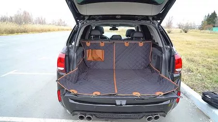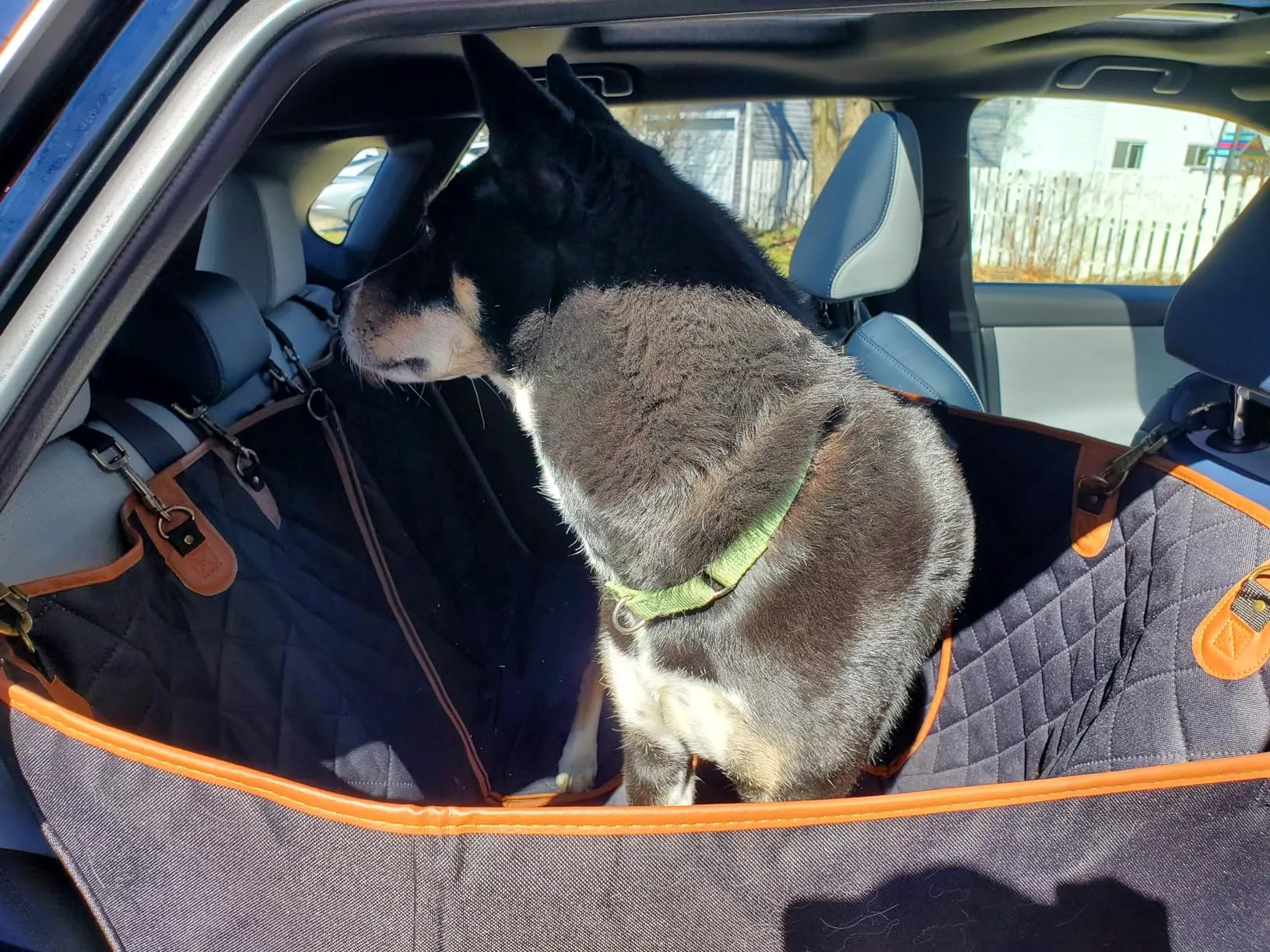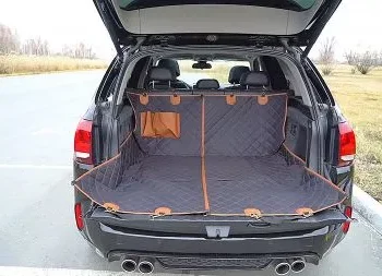 Bought this for our 2 fur babies. It fit perfectly in the back seat of our full size Chevy Silverado. Kept them in the back seat while protecting the leather seats and kept them out of the floorboards.