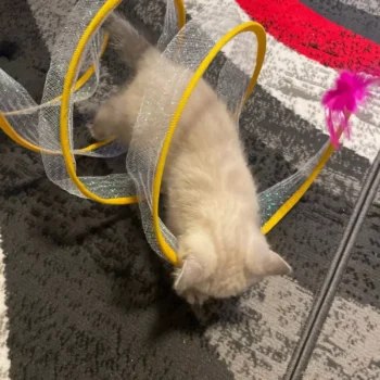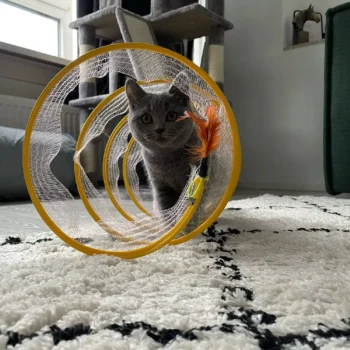 i’m really pleased with this cat tunnel. my cats absolutely love it. the crinkly fabric is a big hit and they enjoy running through it and hiding. it’s well-made and sturdy, and the setup was quick and easy. it’s also lightweight and easy to move around, which is great. the tunnel folds up nicely when not in use, saving space. my cats are more active and playful now. this tunnel has definitely added a lot of fun to their playtime. highly recommend it for anyone with cats.