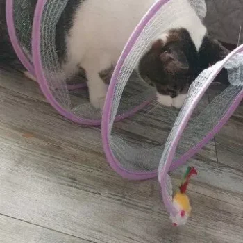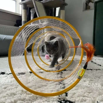 This cat adventure tunnel has been a hit with my cats. they absolutely love running through it and playing hide and seek. the material is sturdy and the crinkly texture adds an extra element of fun. it was easy to set up and is lightweight enough to move around the house. the tunnel also folds up nicely when not in use, making it easy to store. since we got this tunnel, my cats have been more active and entertained. it’s great to see them enjoying themselves so much. the tunnel is spacious enough for them to play comfortably and they love the different entrances. this has been a great addition to their toys and has provided endless hours of fun. i highly recommend this tunnel to other cat owners looking for a durable and entertaining toy for their furry friends.