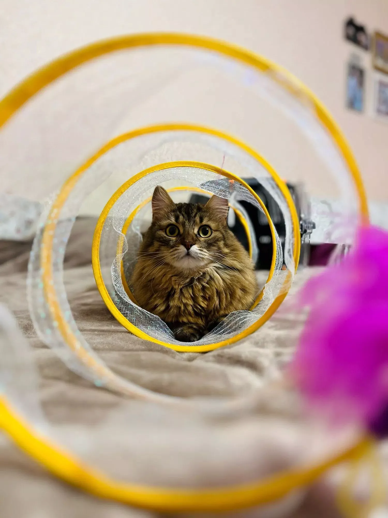 This tunnel has been a hit with my cats. they love running through it and playing hide and seek. the material is sturdy and the crinkly texture adds an extra layer of fun. it was easy to set up and is lightweight enough to move around the house. it also folds up nicely when not in use. my cats are more active and entertained since we got this. it's been a great addition to their playtime. i’m very happy with this purchase and recommend it to other cat owners.