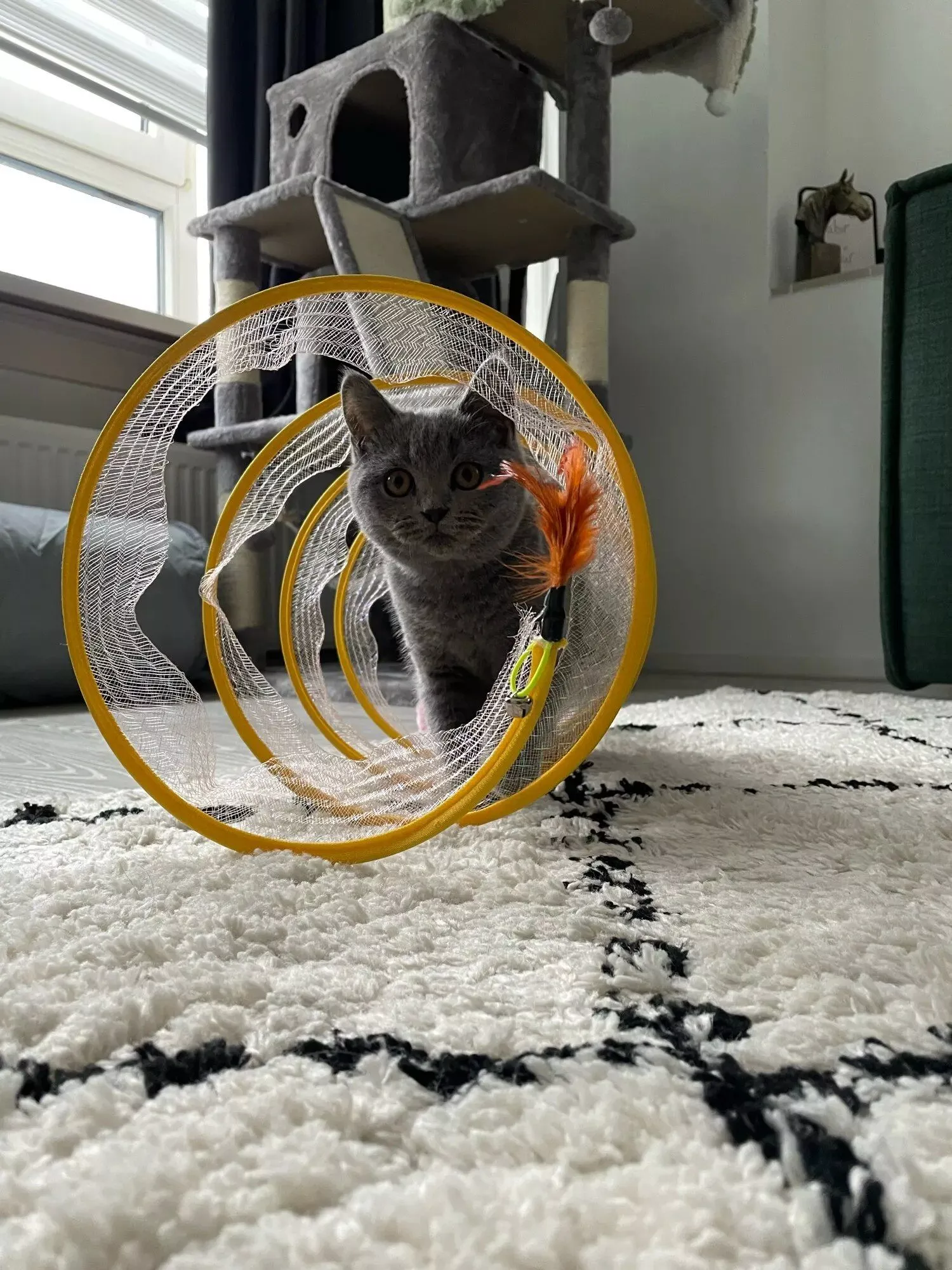 This cat adventure tunnel has been a wonderful purchase. my cats are obsessed with it and spend hours playing in it. they love the crinkly sound and enjoy running through the tunnel and hiding in it. the material is durable and it was very easy to set up. the tunnel is lightweight, making it easy to move around the house to different play areas. it also folds up nicely for storage, which is a big plus. since we got this tunnel, my cats have been more active and entertained. they love the multiple entrances and the spacious interior. it’s great to see them having so much fun and being so playful. this tunnel has been a great addition to their toy collection and has provided endless hours of enjoyment. i’m very happy with this purchase and highly recommend it to other cat owners looking for a fun and durable toy for their furry friends.