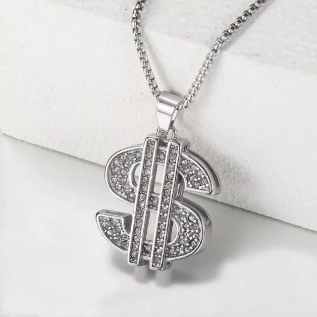 Crafted with precision, our necklace features a striking US Dollar symbol charm, adorned with sparkling Cubic Zirconia (CZ) stones that catch the light beautifully. The pendant, showcasing meticulous attention to detail, hangs gracefully from a sturdy link chain. Made from high-quality stainless steel and available in a luxurious gold and silver color, this necklace is as durable as it is stylish.
